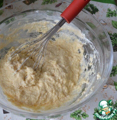 В муку разбить яйца, влить ряженку, добавить сахар и соль.