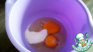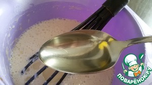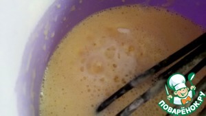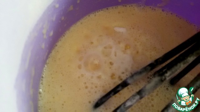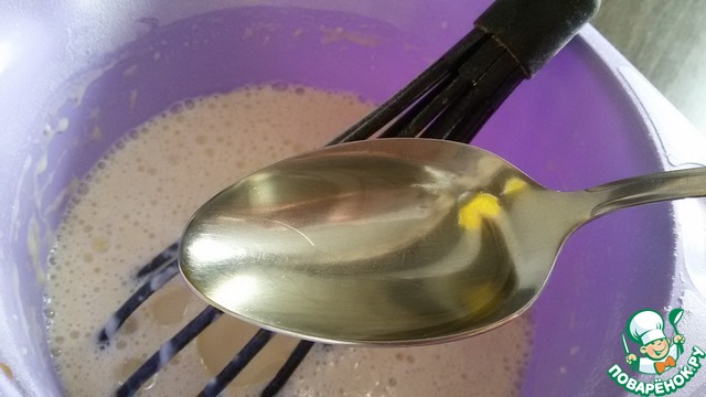 Влить к яичной массе молоко, воду и растительное масло. Взбить до однородности.