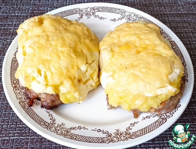 Мясо отбейте, посолите и поперчите. Выложите на пергамент смазанный маслом. Смажьте кетчупом, выложите тонко нарезанный лук, затем картофельное пюре. Сметану смешайте с чесноком, можно подсолить немного и смажьте картофель. Выпекайте в разогретой до 180С духовке 30 минут, затем присыпьте сыром и отправьте в духовку еще на 5 минут.