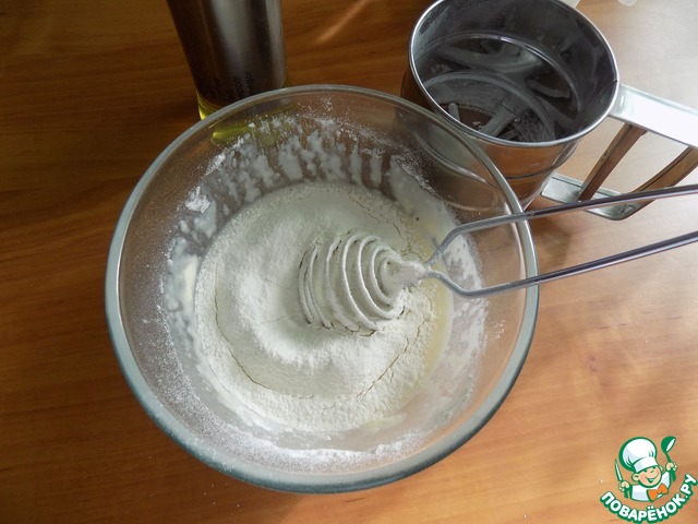 Муку нужно просеять. Раньше, я помню из детства, пользовались ситом. Просеиваем всю муку и венчиком соединяем. Тесто густое.