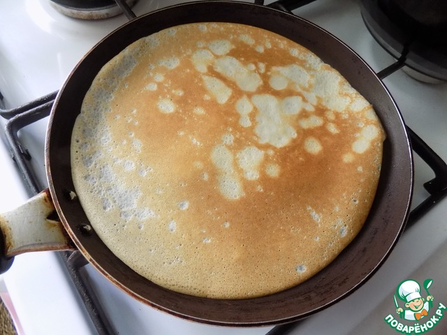 На один блин я брала 1/2 поварёшки теста, выливала его на сковороду, распределяя ровным тонким слоем по сковороде. Огонь не убавляла. Блины выпекаются очень быстро. Когда блин схватится с одной стороны и будет красивого золотистого цвета... -