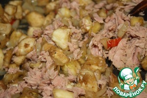 Затем добавляем мякоть баклажана и через несколько минут размятый тунец.