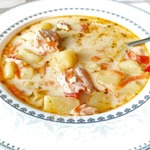 Очень нежная и насыщенная сливочная уха. Я буду использовать недорогую и весьма необычную по вкусу рыбу зубатку. По этому рецепту можно также использовать семгу или горбушу.