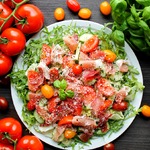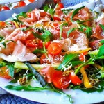 Хочу предложить рецепт вкусного, легкого салата из рукколы, сыровяленого свиного окорока, пармезана и овощей. Идеальный вариант ужина, а также хорошее дополнение к любому мясному блюду. Хамон можно заменить на прошутто, пармскую ветчину или на ветчину брезаола.