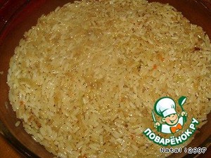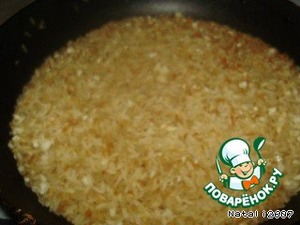 • Рис обжарить с чесноком на сковороде без жира до золотистого цвета.