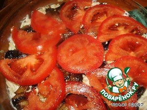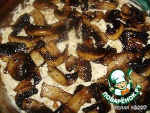 • Сверху кладем обжаренные на растительном масле шампиньоны.