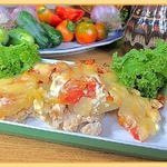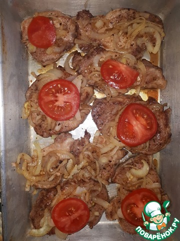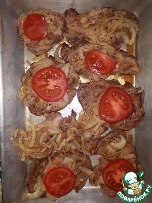Выложить на мясо обжаренный лук. Нарезать помидор кружочками и также положить поверх лука.