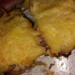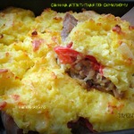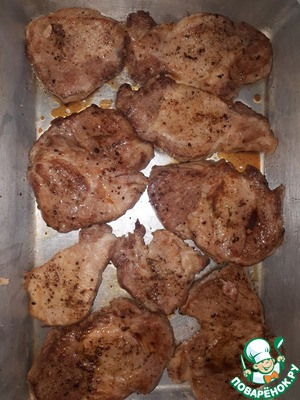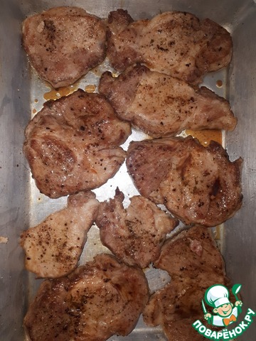 Предварительно отварить картофель в мундире и остудить. Мясо нарезать порционно по 1 см толщиной. Посолить, посыпать специями и обжарить с двух сторон буквально по 3 мин, до золотистого цвета на среднем огне. Переложить в противень.