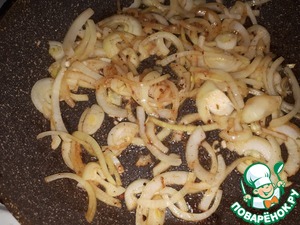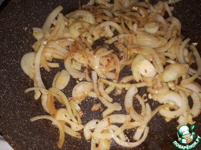 Лук нарезать полукольцами и обжарить в масле с соком от мяса. Я добавляю 1 ч. л. сахара, чтоб он стал более золотистым.