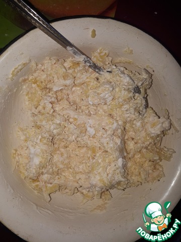 Натереть очищенный (сваренный в мундире) картофель и сыр на крупной терке. Заправить сметаной и тщательно аккуратно перемешать. Можно не солить, т. к. сыр когда тает придает свою соленость.