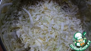 Капусту нашинковать. Сверху полить лимонным соком, посыпать солью и как следует помять. -
