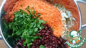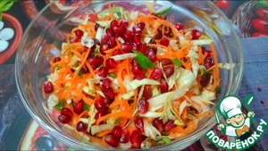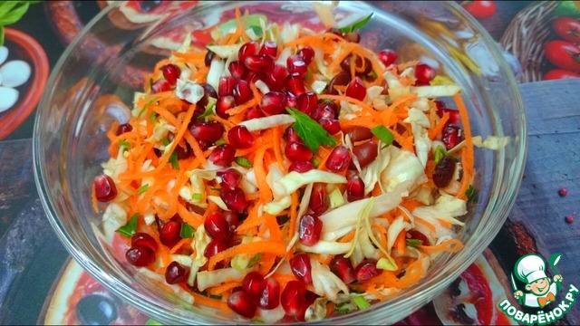 Свежая капуста, морковь и фасоль украшенные зеленью. В сезон замечательно дополняется гранатом!
