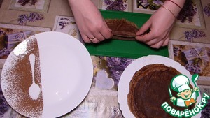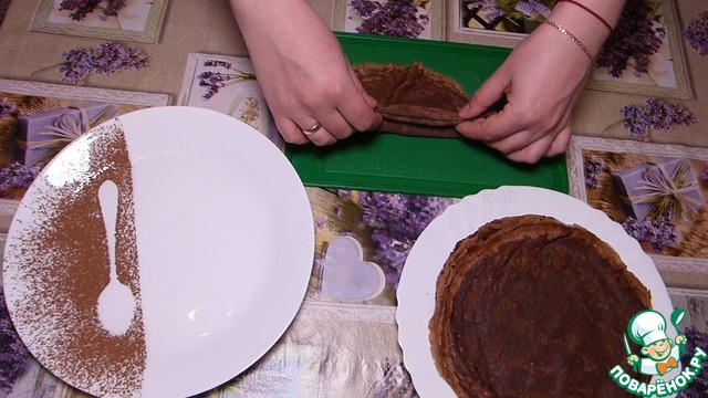 Блюдо для подачи накрываем листом А4 наполовину. На вторую половину выкладываем чайную ложечку. Посыпаем какао.