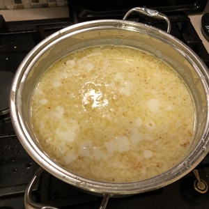 Когда рис почти готов, вливаем мацони и сметану в кастрюлю с рисом и, постоянно помешивая, доводим до кипения, добавляем обжаренный лук и отставляем кастрюлю с огня.