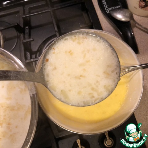 В той же миске взбиваем 3 яйца и, продолжая взбивать венчиком, постепенно вливаем к яйцам горячий суп, сколько поместится