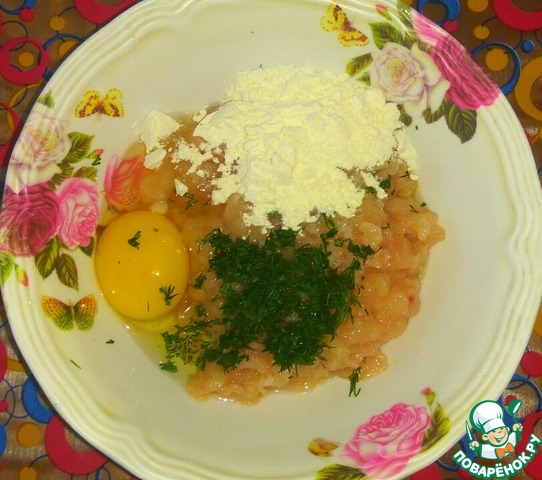 Добавить соль, перец, мелко нарезанный укроп, яйцо, муку и при желании можно ещё чеснок добавить. Перемешать.