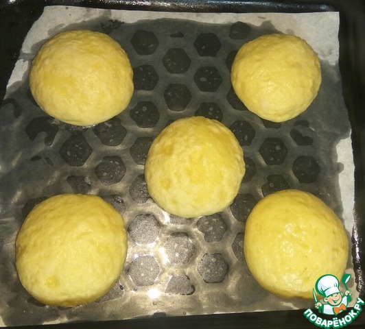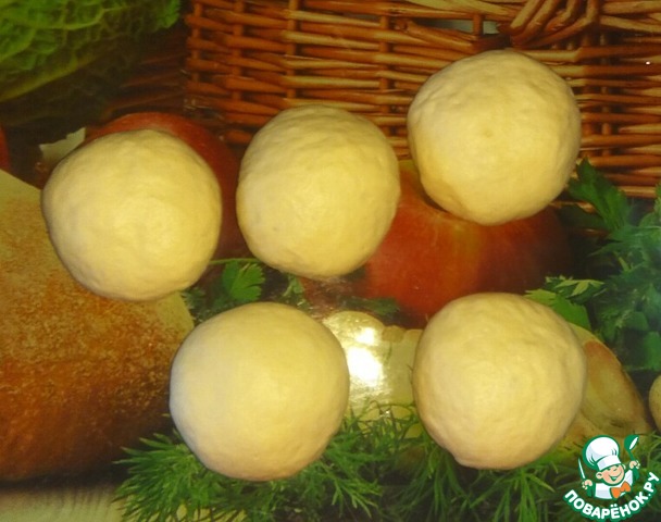 Подошедшее тесто обмять, разделить на 5 кусочков. Подкатать каждый кусочек теста в шар. Оставить на 15-20 минут подойти.