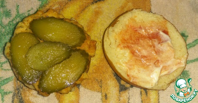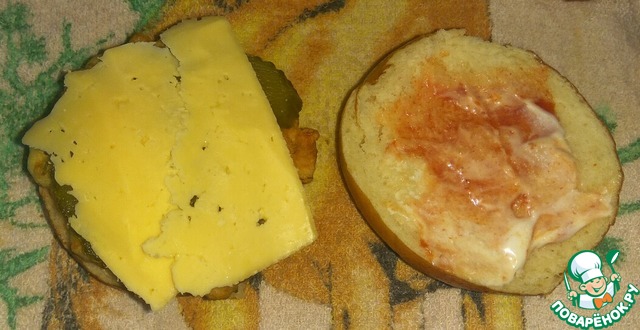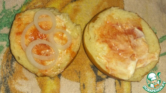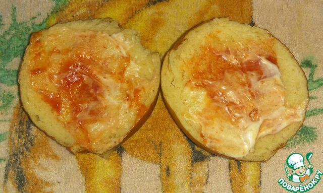 Накрыть второй половиной булочки. Отправить в духовку на 5-7 минут до расплавления сыра.