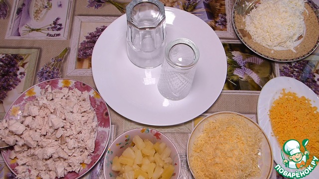 У меня консервированные ананасы уже нарезаны, если у Вас кольцами, нарезаем на небольшие кусочки.