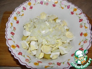 Яйца отварить, нарубить и тоже добавить к картофелю