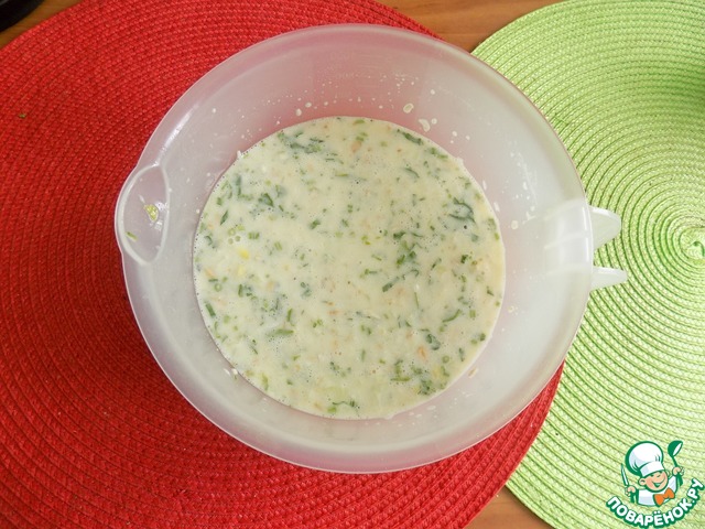 Лук нам нужно очень мелко измельчить. Я буду использовать измельчитель. У кого нет, то его можно натереть на мелкой тёрке. Хлопья у нас разбухли минут за 10. Разбиваем яйца в них, перемешиваем венчиком. Просеиваем в посуду с хлопьями муку, опять соединяем. Получилось тесто. Петрушку отправляем в тесто.