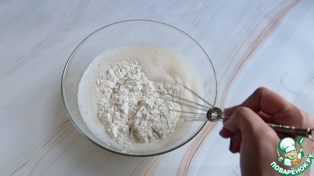 Постепенно добавляя муку, довести консистенцию теста до состояния жидкого кефира.