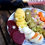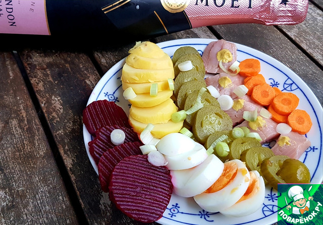 Разделанную и вымоченную сельдь заправить смесью растительного масла, горчицы и уксуса. Вокруг сельди положить кучками овощи, перемежая их кружками вареного яйца и колечками репчатого лука. Вместо соленых огурцов можно использовать нарезанные дольками свежие помидоры и огурцы.