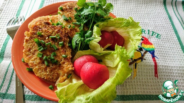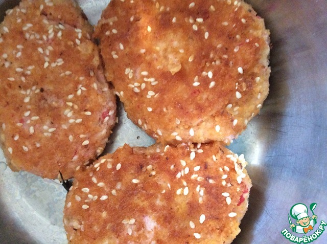 Мокрыми ручками лепим котлетки, обваливаем в сухарях + кунжут слегка, и жарим на растительном масле с 2-х сторон.