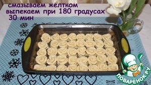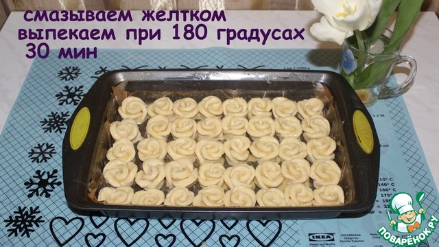 Выкладываем на противень и смазываем желтком. Выпекаем при 180 градусах 30 минут.