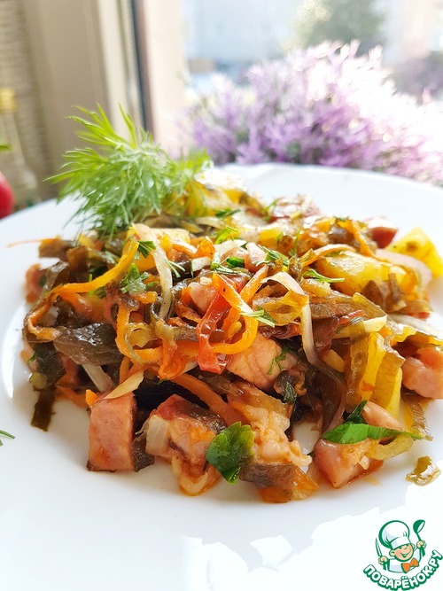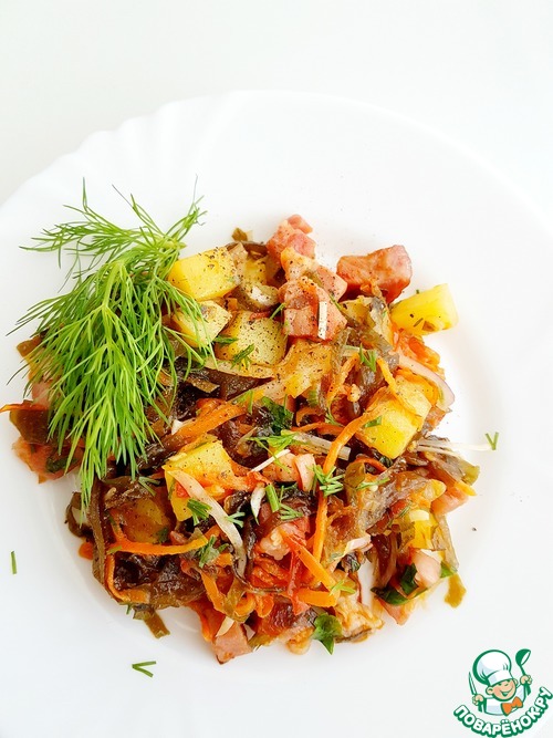 Добавить морскую капусту и мелкорубленный чеснок. При необходимости добавить немного кипятка, чтоб не пригорало.