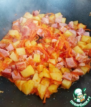 Лук и морковь нашинковать, помидор натереть на крупной тёрке, либо нарезать кубиком, картофель и окорок нарезать кубиками. В сковороде с толстым дном на небольшом количестве растительно масла пассеровать лук, морковь, картофель, помидор и касслер (окорок). Помешивать и готовить около 2-5 минут.