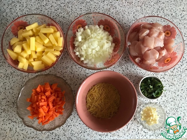 Для начала хочу сказать, что в этом рецепте абсолютно отсутствую жиры. Мы не используем масло для жарки. Бульон у меня уже был сварен (и заморожен впрок).