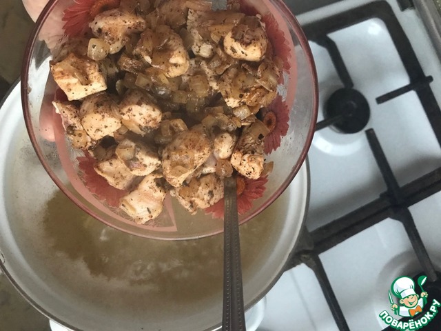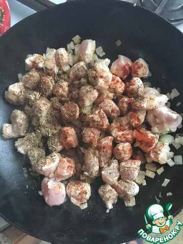 Затем лук (до прозрачности) и филе куриное. Обязательно добавляем в горячую сковороду специи (перец черный, паприку, мускатны орех). При контакте со сковородой специи раскрываются. Все перемешиваем.