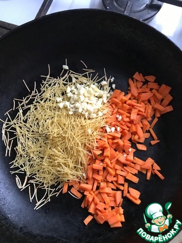 Далее морковь (так же сухая сковородка). Затем выкладываем чеснок, чуть подрумяниваем. И добавляем макароны-паутинку.