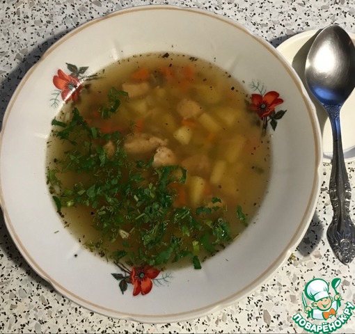 В кипящий бульон выкладываем по очереди картофель, филе, морковь и макароны с промежутком 5 минут. Пробуем на соль. Даем покипеть 15 минут