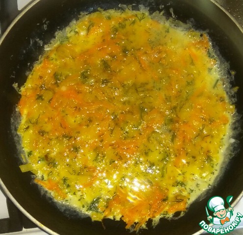 Яйца взбить вилкой со щепоткой соли и мелко нарезанным укропом. Влить к овощам. Накрыть крышкой, жарить на небольшом огне, пока омлет не схватится.