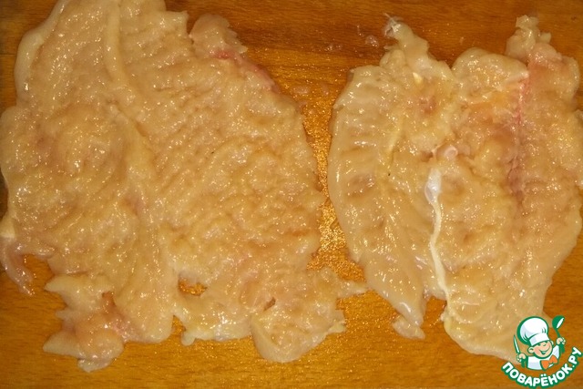 Филе разрезать на 2 пласта. Отбить. Промокнуть бумажным полотенцем. Посолить и поперчить по вкусу.