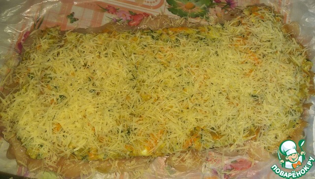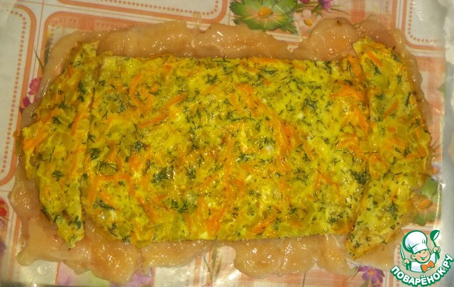 На филе выложить яично-овощной омлет (края омлета обрезать и тоже сформировать из него прямоугольник).