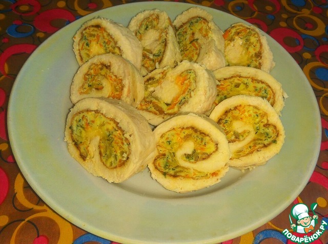 Выложить наш рулет в сковороду. Готовить на небольшом огне под крышкой 10 минут, затем перевернуть на вторую сторону и готовить ещё 10 минут. -