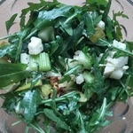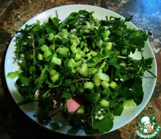 Выложить порционно на тарелки (можно сделать и в салатнике, но подача будет менее эффектная) рукколу, сверху мелко нарезанный сельдерей. Посолить по вкусу (я использовала смесь перцев с морской солью), немного сбрызнуть винным уксусом, соком лимона или бальзамическим соусом. -