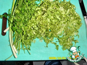 Нарезать листья салата, зеленого лучка, укроп и кинзу
