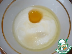 Приготовим тесто: в миску наливаем кефир, добавляем сахар, соль, яйцо. Всё хорошо перемешиваем венчиком.
