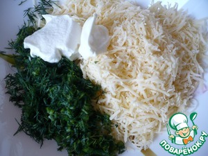 Тесто отставляем в сторону и тем временем приготовим начинку: в миску положить натертый на мелкой терке сыр, добавляем сметану, натертый на мелкой терке чеснок и мелко нарезанный укроп. Всё хорошо перемешать.