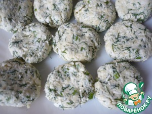 Из приготовленной начинки сформируем небольшие лепешки, чтобы их можно было удобно выкладывать на оладьи.