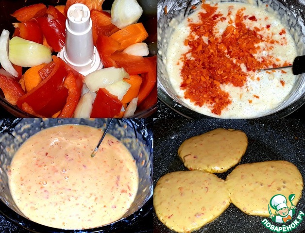 Оладьи закусочные с добавлением овощей. Болгарский перец, морковь и лук придают оладьям пикантность. Мне нравится это сочетание. Часто использую все эти овощи в салатах и горячих блюдах.