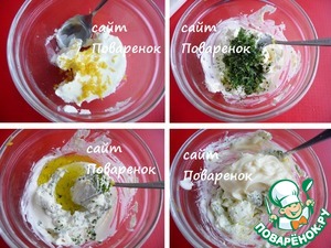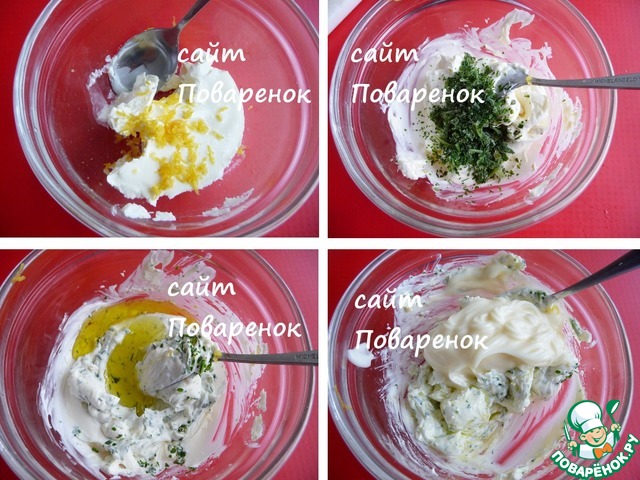 Для соуса смешать сливочный сыр, сок лимона,