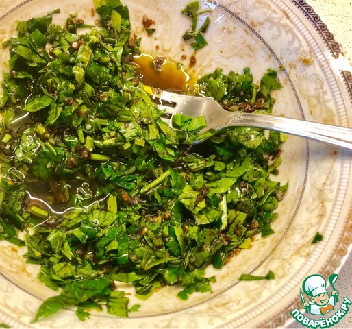 Для заправки чеснок пропустила через пресс. Петрушку мелко нарезала. В глубокой пиале смешала петрушку и чеснок. Добавила оливковое масло, бальзамический уксус. Добавила соль и перец на глаз. Хорошо все взбила вилкой.