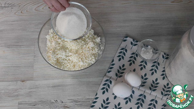 К творогу добавляем растительное масло, сахар. Если творог зернистый, как у меня, пропускаем через сито или пробиваем погружным блендером. Если творог мягкий шаг пропускаем.