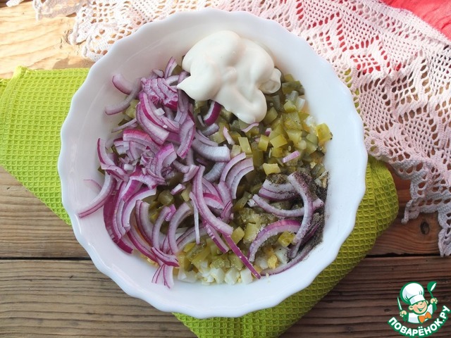 Соединяем все ингредиенты, добавляем майонез, соль и черный перец.