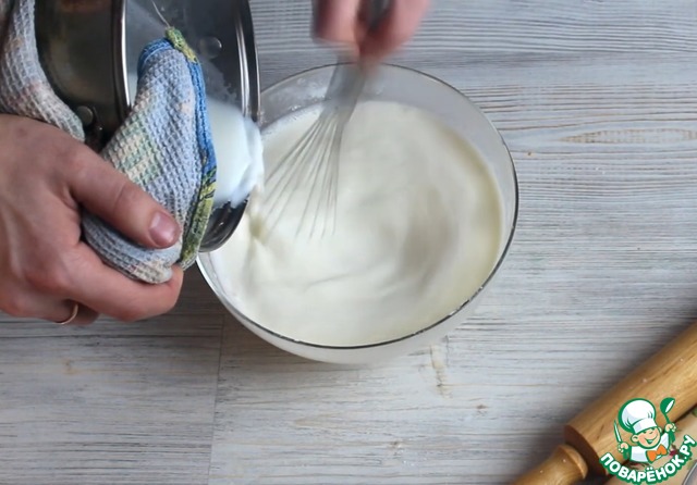 5. Тонкой струйкой при постоянном взбивании венчиком вливаем горячее молоко в яичную смесь. Переливаем молочно-яичную смесь в кастрюлю.